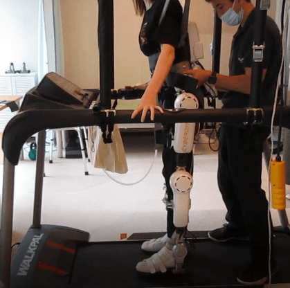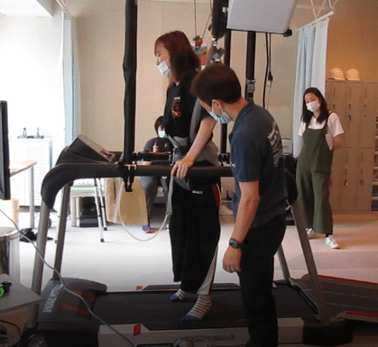 HAL®を装着後、トレッドミル上でまずは左右の体重移動と足をあげる動作の練習をします。