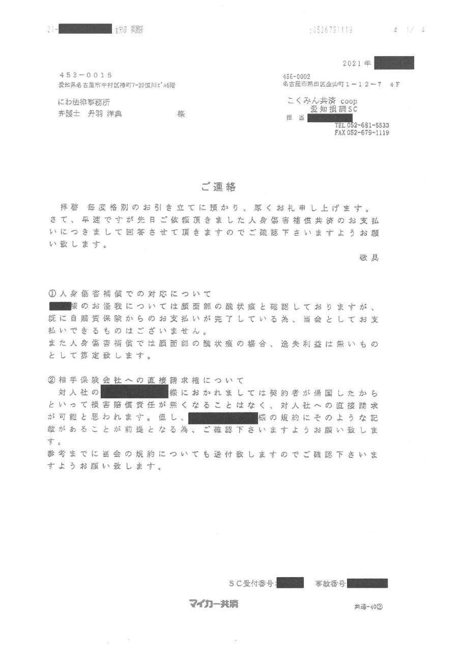 本件は、依頼者様が全労済に加入している事案で、自賠責で外貌に相当程度の障害を残したものとして9級16号の認定を受けた方で、相手方外国人が無断で帰国してしまったため、相手方に対する損害賠償請求訴訟を提起しても、相手方の居所の調査や送達等で大変時間がかかることを考慮し、事情を詳細に説明したうえで先行して全労済に対し人身傷害共済を請求をすることにしました。