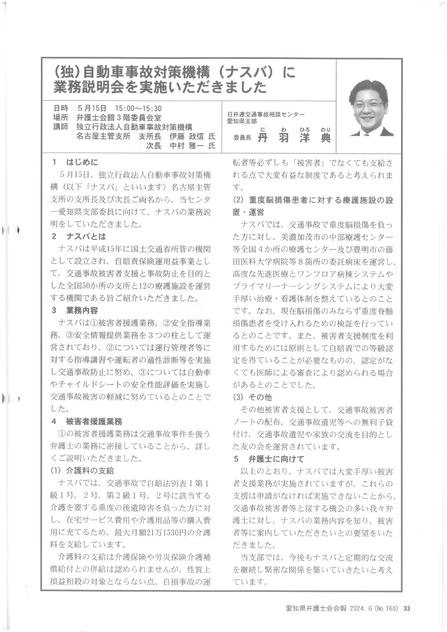 - (独法)自動車事故対策機構(ナスバ)名古屋主管支所様主催「介護料受給者等交流会」で、「成年後見制度について」と題する講演を行いました。