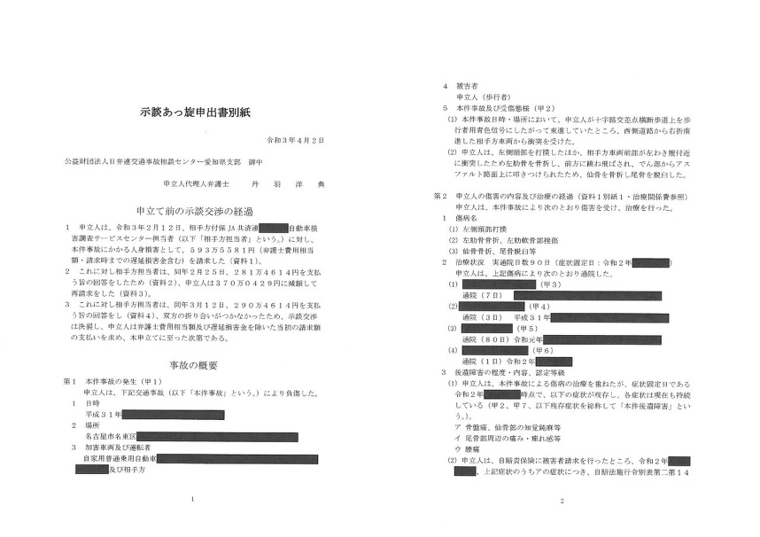 当事務所では、これまでこれらのADRは一般の方々が利用する手続であり、弁護士としては相手方任意保険会社等との示談交渉が決裂した場合、即刻裁判所に対し訴訟を提起すべきと考えておりましたが、日弁連交通事故相談センター愛知県支部から上記FAXが届いたのを機に、改めて「示談あっ旋」が交通事故被害者の方々にとって有益かを確認するため、令和2年末から3件の弁護士持ち込み案件での「示談あっ旋」を申立てました。