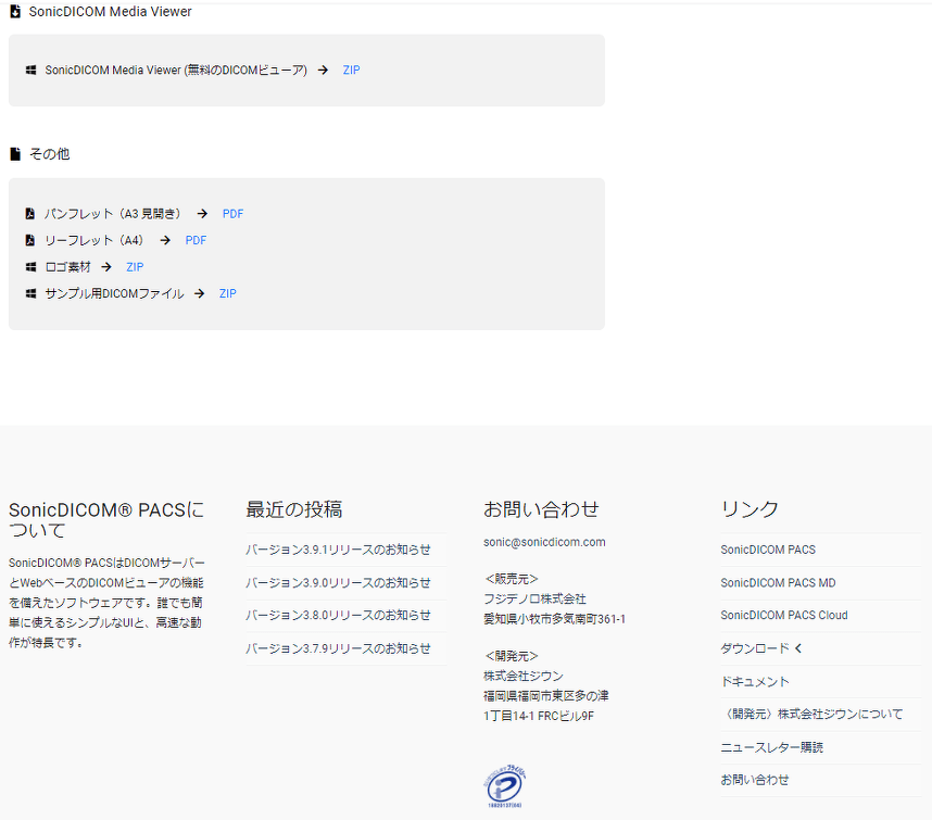 ダウンロード方法ですが、以下の株式会社ジウン者様のダウンロードページにアクセスし、「SonicDICOM Media Viewer」のZipファイルをダウンロードします。