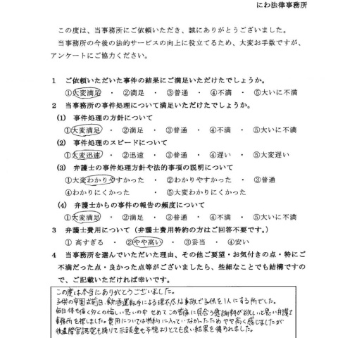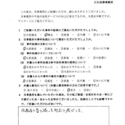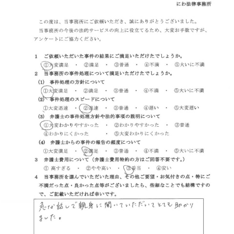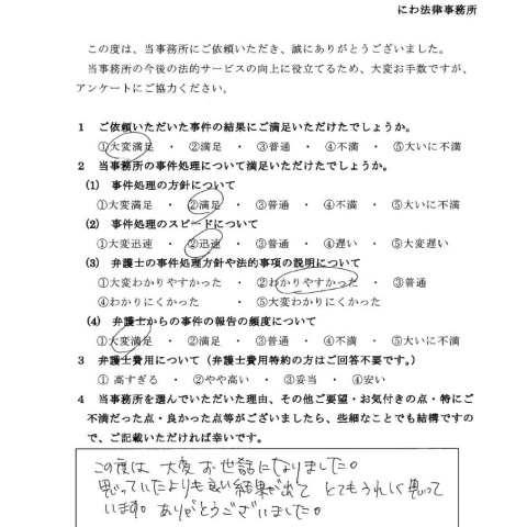 当事務所は、更なる法的サービスの充実を図るため、ご依頼いただいた事件が終了した際、依頼者様にアンケートのご協力をお願いしております。