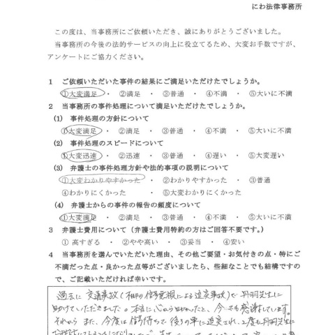 交通事故で辛い思いをされている依頼者様の立場に立った丁寧かつ親身な対応を理念とする当事務所にとって、法的なサービスの内容だけでなく、特に弁護士やスタッフの応対についてお褒めの言葉をいただくことは、最も嬉しく励みになります。