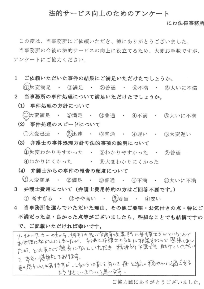 - 交通事故の豊富な知識と、被害者に寄り添う温かい人柄でとても安心できました。