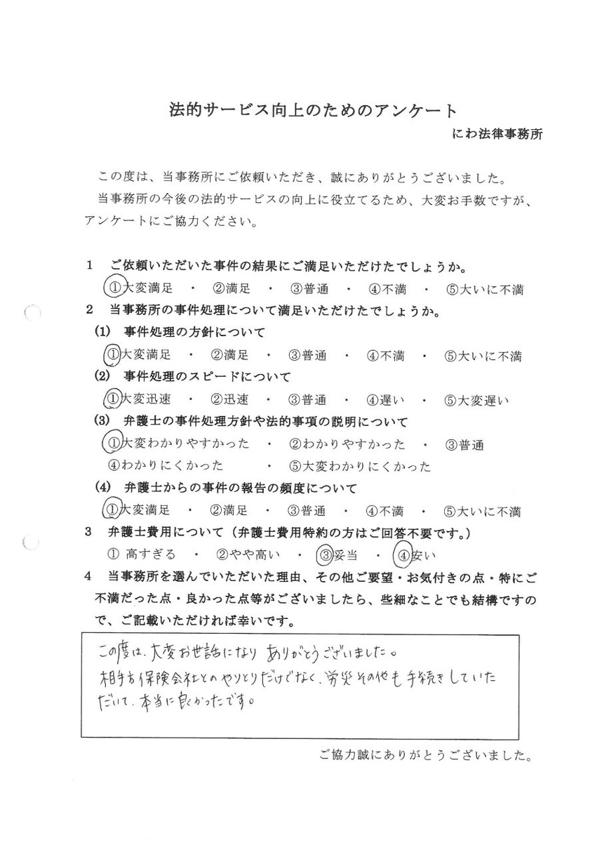 相手方保険会社とのやりとりだけでなく、労災その他も手続きしていただいて、本当に良かったです