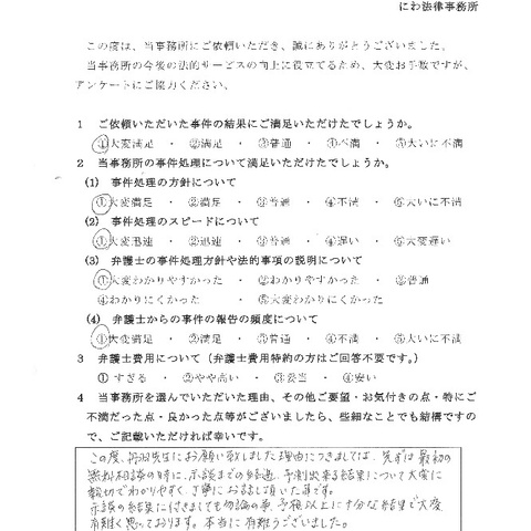 当事務所は、更なる法的サービスの充実を図るため、ご依頼いただいた事件が終了した際、依頼者様にアンケートのご協力をお願いしております。