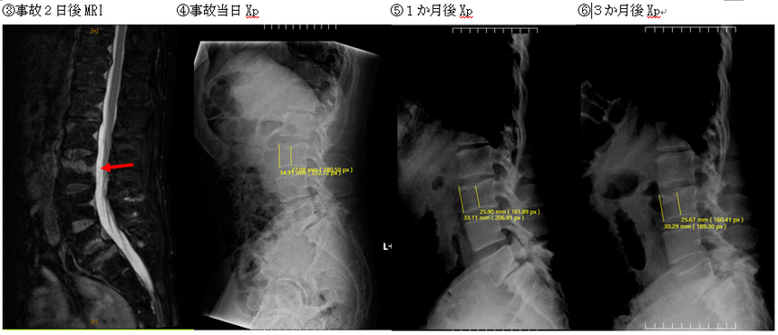 例えば、下記画像の第3腰椎は、事故当日に撮影されたXp上(画像④)、前縁椎体高34.91㎜、中央椎体高27.08㎜だったのが、事故3か月後には(画像⑥)前縁椎体高30.29㎜、中央椎体高25.67㎜まで減少しています。