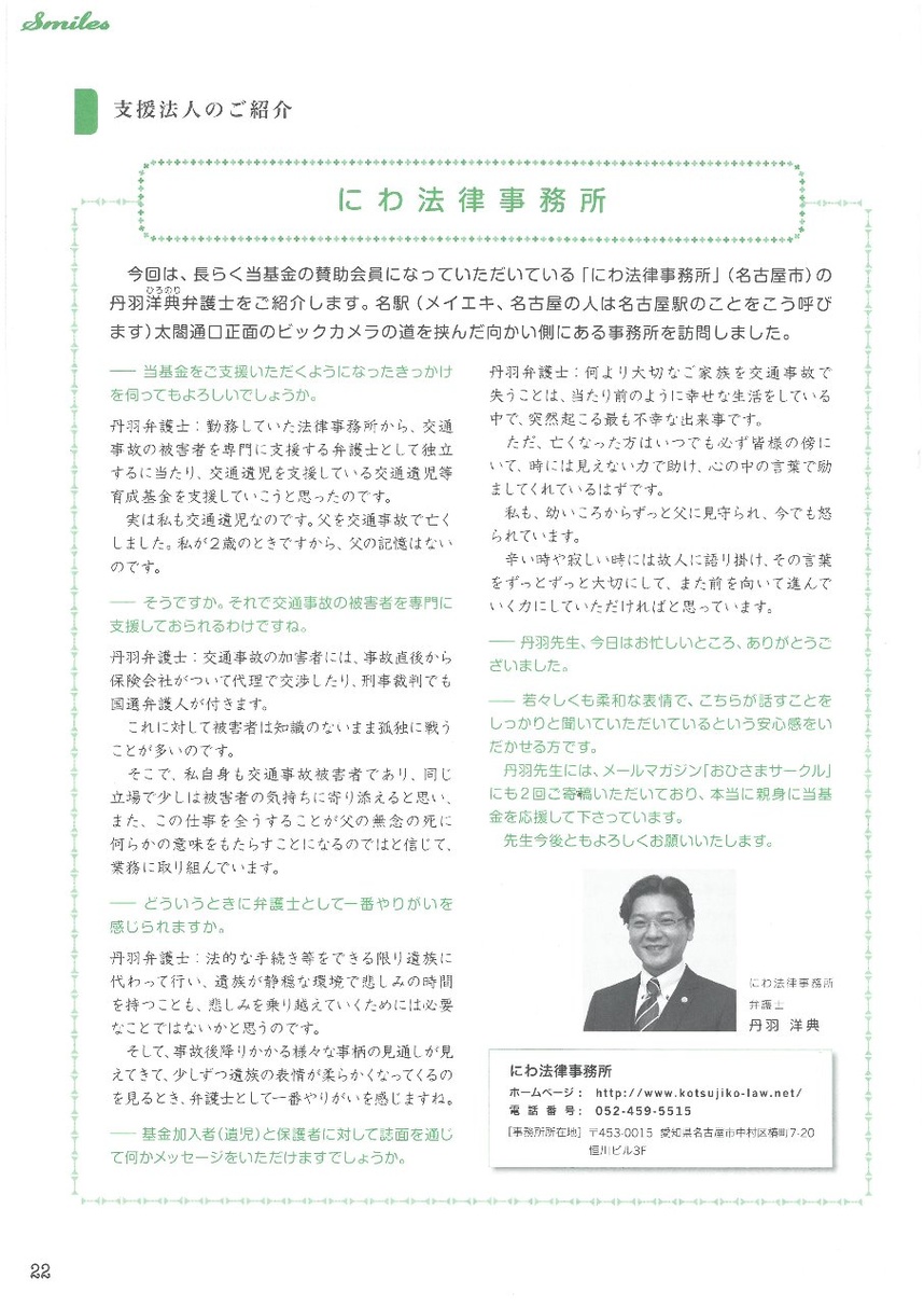 当事務所及び弁護士丹羽は、今後とも、同基金の活動を通じて、少しでも交通遺児の方々の笑顔を取り戻すお手伝いができたらと心より願っております。