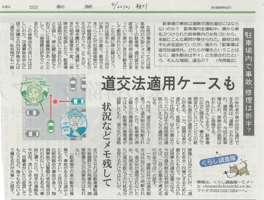 平成29年4月22日付中日新聞朝刊生活面くらし調査隊「駐車場内で事故、修理は折半?」との記事で、弁護士丹羽が、駐車場内で事故でも道路交通法の適用の可能性があることや、過失割合について、駐車場内の事故が起こった場所や、駐車場内での通行指示、相互の車両の動きを具体的に検討したうえで決められるため、保険会社担当者の「駐車場内は道交法の適用がないから、過失割合は半々」との主張は大きな誤りであることなどをコメントしました。