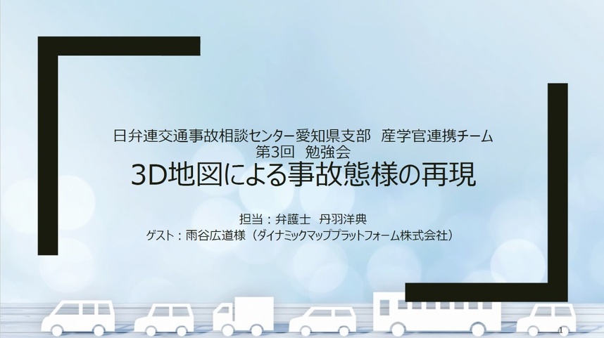 弁護士丹羽は、令和5年5月31日、日弁連交通事故相談センター愛知県支部産官学連携チーム及び名古屋大学地域を次世代につなぐマイモビリティ共創拠点が共催し、名古屋大学未来社会創造機構モビリティ社会研究所に後援いただき、ダイナミックマッププラットフォーム株式会社執行役員雨谷様とともに、『3D地図による事故態様の再現』と題した勉強会をZoomウェビナーにより開催いたしました。