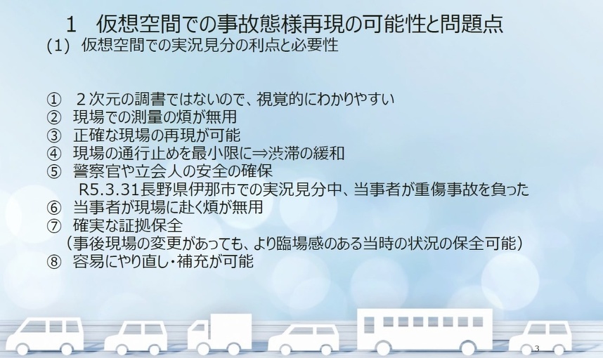 そして、仮想空間での実況見分や事故再現についての刑事証拠法上問題点を挙げた後、令和4年10月の報道された大阪府警が確立した3Dマップによる仮想現場再現法について議論いたしました。